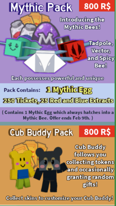 Bee Swarm Leaks On Twitter Mythic Pack 800 R The Mythic Pack Gives 1 Mythic Egg 250 Tickets 25 Red And Blue Extracts Cub Buddy Pack 800 R The